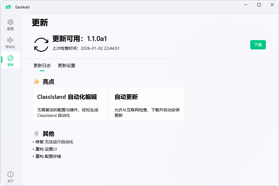 即将推出的 EasiAuto 1.1 聚焦于简化用户体验,降低使用门槛。新增加的用户界面基于 qfluentwidget,美观、方便、易用。编辑「设置」再也不用改配置文件;全新的「ClassIsland 自动化编辑」带来了前所未有的自动化编辑体验,极大降低使用难度;还有「自动更新」功能,让接收功能改进和问题修复更及时。