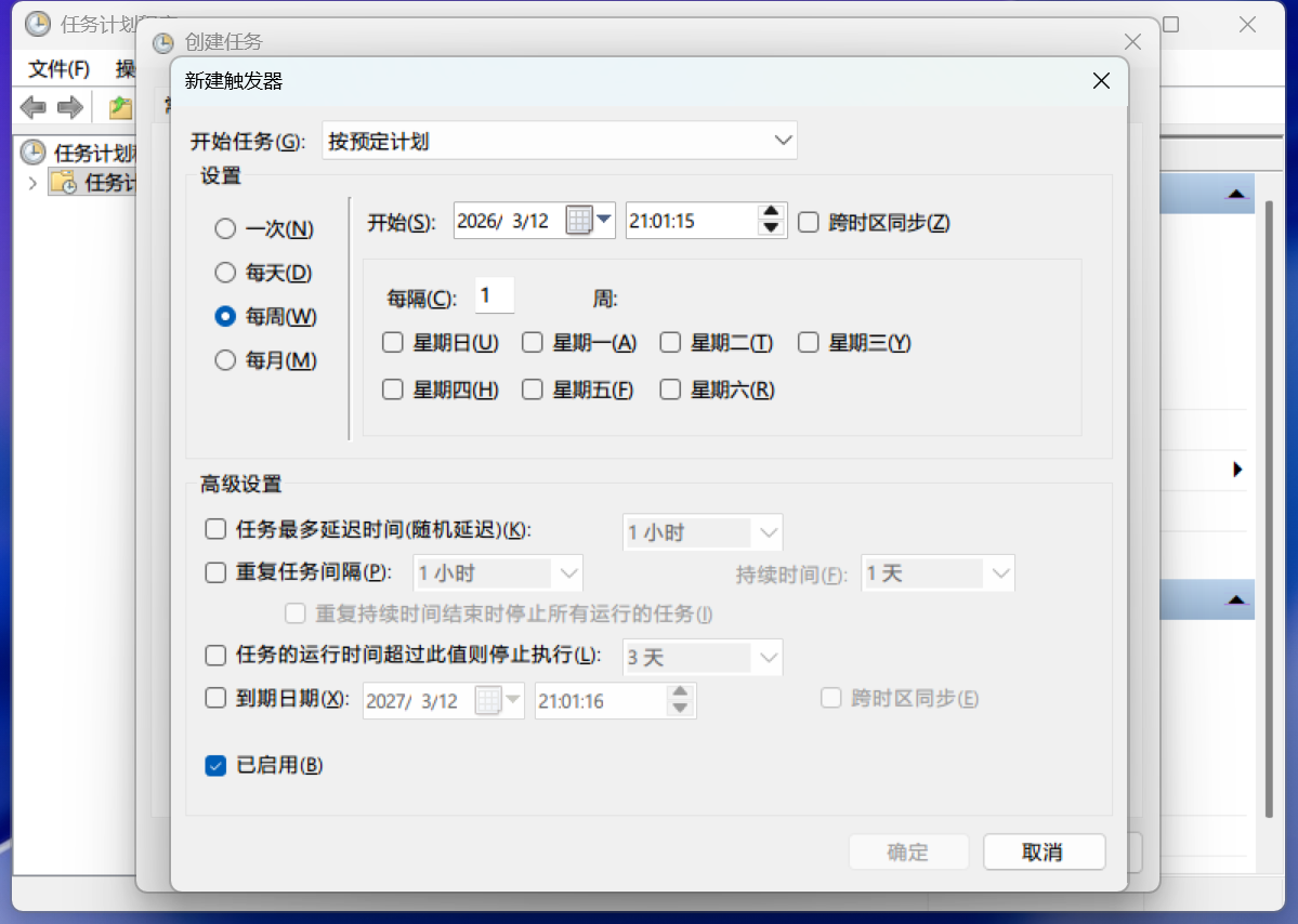 开始任务选择“按预期计划”,选择每周,并勾选需要的星期(例如这里选择周一到周四,周五特殊放学时间稍后再新建一个触发器),开始日期填的比当天早就行,时间输入需要在当天关机的时间