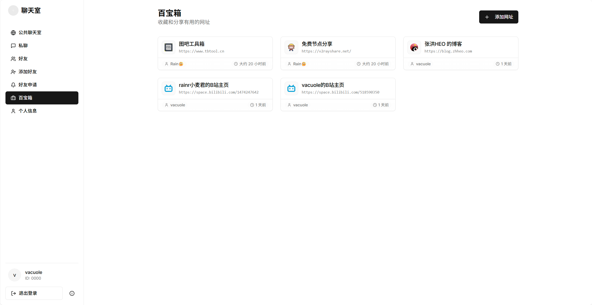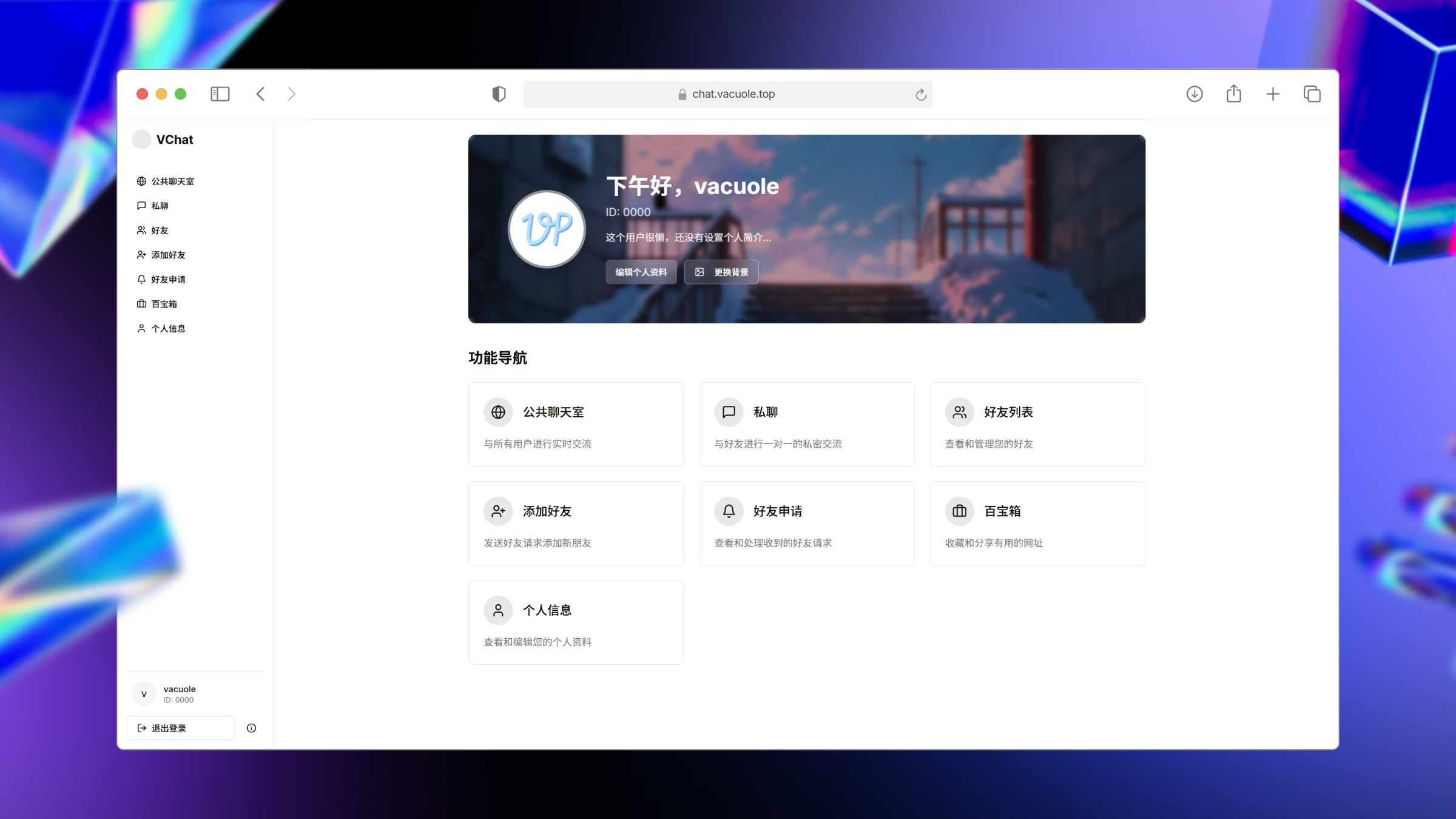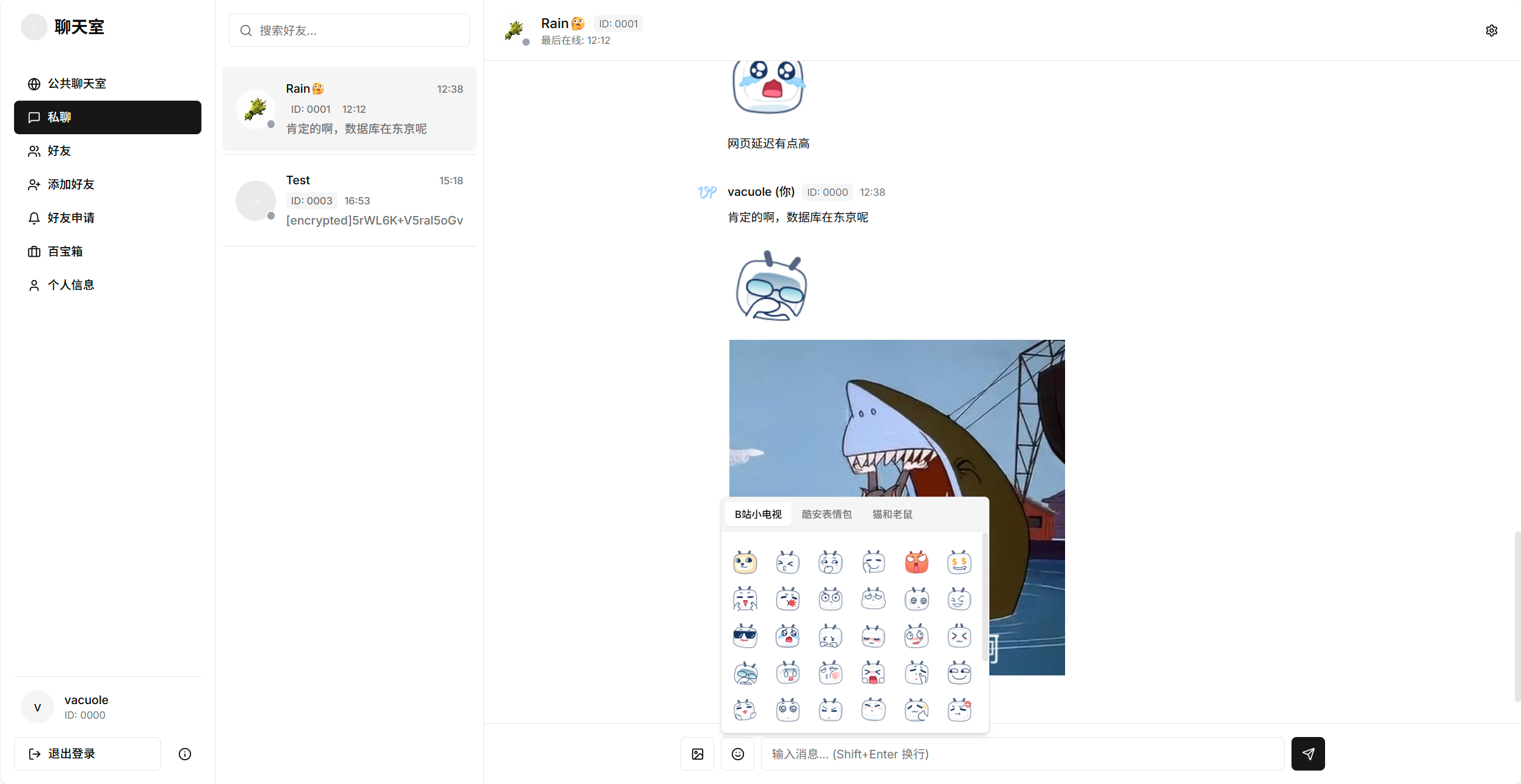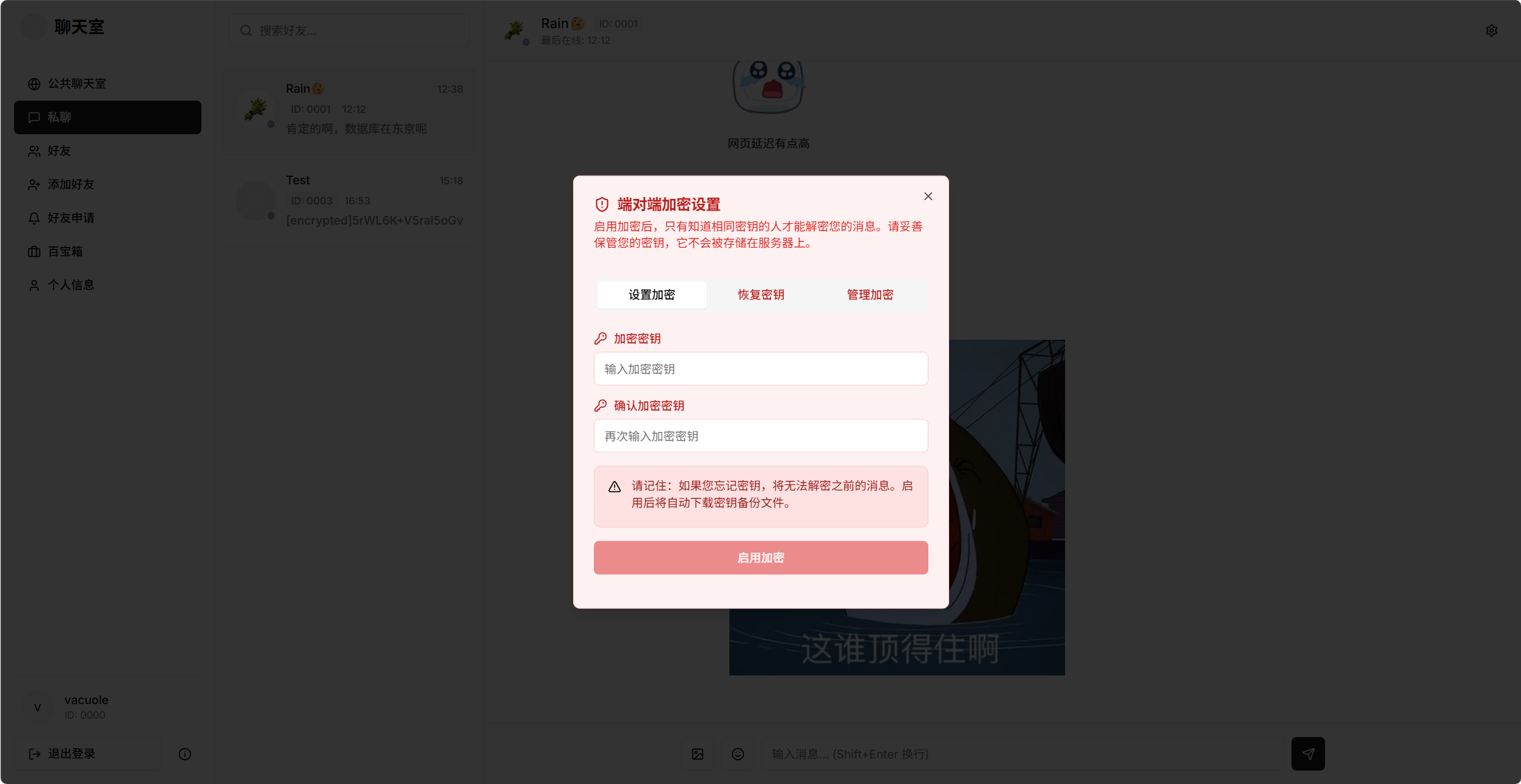 VacuolePao 前言 步入高中,意味着与昔日的好友分别,踏入不同的校园。 对于住校的朋友,更是难以保持联系。 展示 🎉特色功能 4位ID+6位PIN极速d登录,无需手机 支持数据库realtime实时订阅,无需刷新与轮询就能获取最新消息 支持添加好友与私信,好友申请与私信有实时提醒 页面失去焦点后定时锁定,防止被他人偷看,锁定时间可自定义 百宝箱页面,用户可自由添加收藏网址,方便在学校中使用 支持twikoo格式的表情包,丰富聊天体验 noionion/Twikoo-Magictree/master 端对端加密功能:双方输入相同秘钥才可发送和查看消息,秘钥不经过数据库与服务器,只存在于本地,数据库中只储存加密后的内容 支持使用秘钥备份文件结果,以防忘记秘钥 接入supabase提供的storage储存桶,可上传头像、图片、个人主页banner 关于项目 本项目是我在短暂的课余时间使用AI工具v0开发的,所以不能保证代码的规范和效率,但是以后我有时间的话会手动修改 数据库和对象存储使用的是supabase提供的免费方案,容量有限,但可以满足基本对话需要 如何使用 制作的初衷就是为了和我的初中好友建立联系,所以没有考虑安全性,免费的数据库和储存容量也有限,并不能支持大量用户使用,所以我没有开放注册 但是如果你也想使用异校互联和身处异校的朋友取得联系,可以联系我添加账号,登录智教论坛以查看我的邮箱↓ 这段内容将在 注册/登录 后刷新后可见 联系我 Discord社区:https://disboard.org/zh-cn/server/1273078781241987134 Bilibili:https://space.bilibili.com/518590350