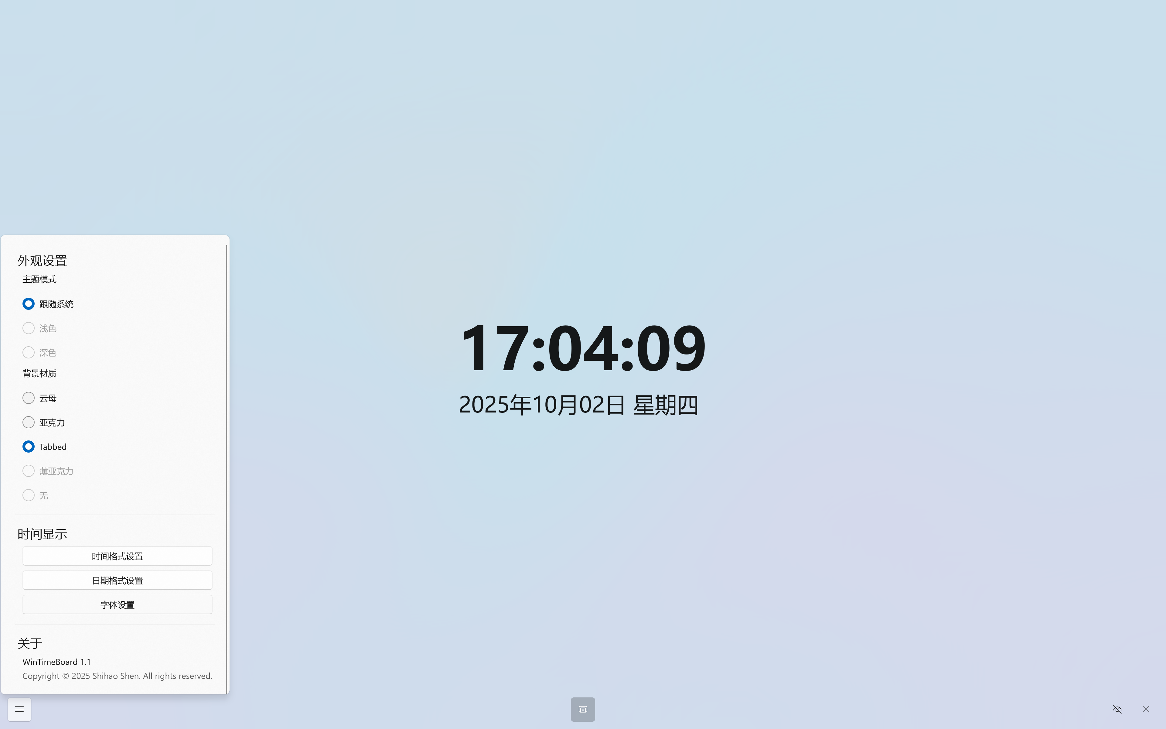 ShihaoShen WinTimeBoard 是一个基于 .NET 10 和 WinUI 3 构建的大屏时钟软件。 详细介绍可以在这里查看。 项目源码:GitLab Gitea 镜像(即时同步) GitHub 镜像(同步最不及时) 下载:GitLab Releases(含国内CDN及Gitea Release源) 截图为1.1版本。 请注意:GitHub源使用过时的1.0源码,我们正在解决同步失败的问题已经弃用此源。 目前我们正在开发1.2版本,该版本将增加启动器功能。